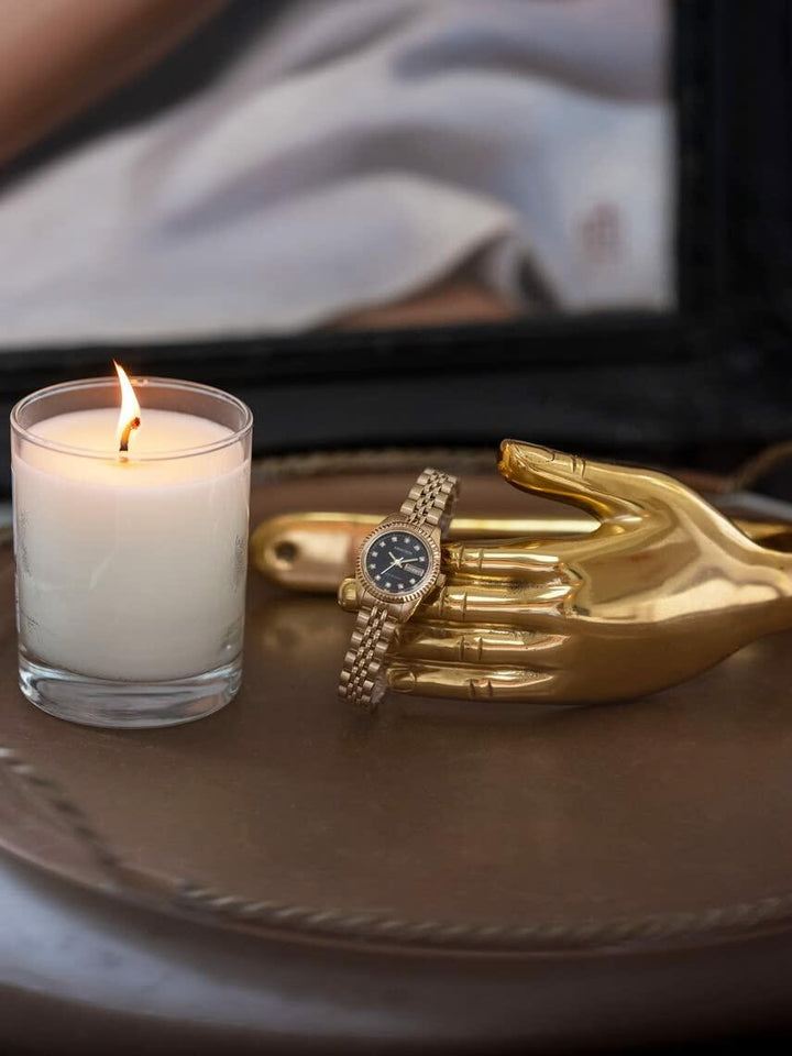 - Black sunray dial with day/date calendar window; gold-tone hands and premium crystal markers; printed outer minute track