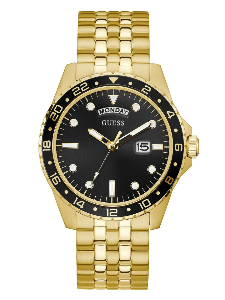 GUESS Men's Dress Day-Date 44mm Watch – Black Dial with Gold-Tone Stainless Steel Case & Bracelet