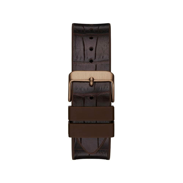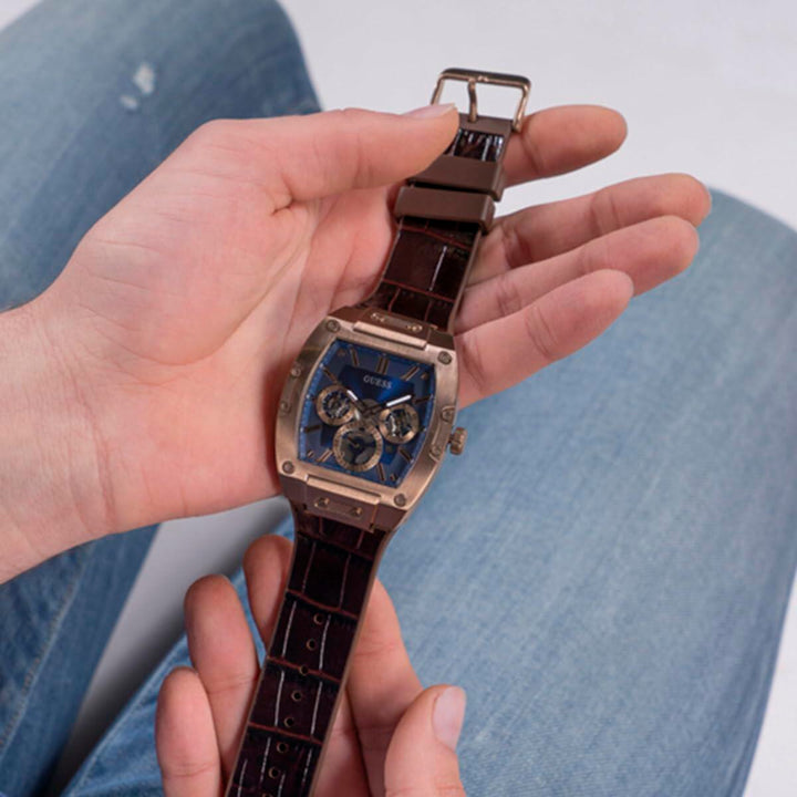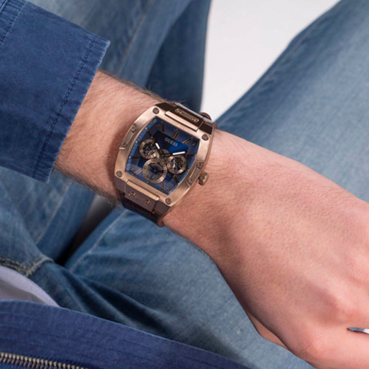 GUESS Mens Trend Multifunction 43mm Watch – Coffee Stainless Steel Case with Blue Diamond Dial & Brown Croco Leather Strap
