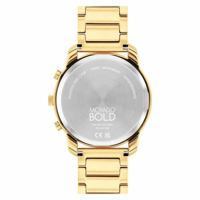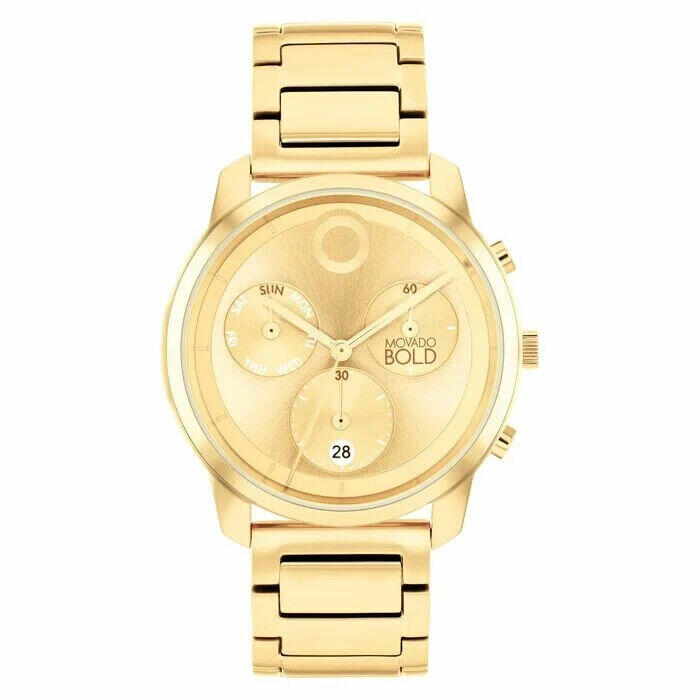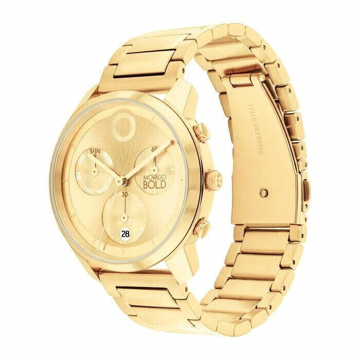 Movado Trend Element Chronograph , 42mm yellow gold PVD case and yellow gold PVD bracelet, yellow gold dial, K1 mineral crystal, Swiss Chronograph Movement. Movement Swiss Quartz